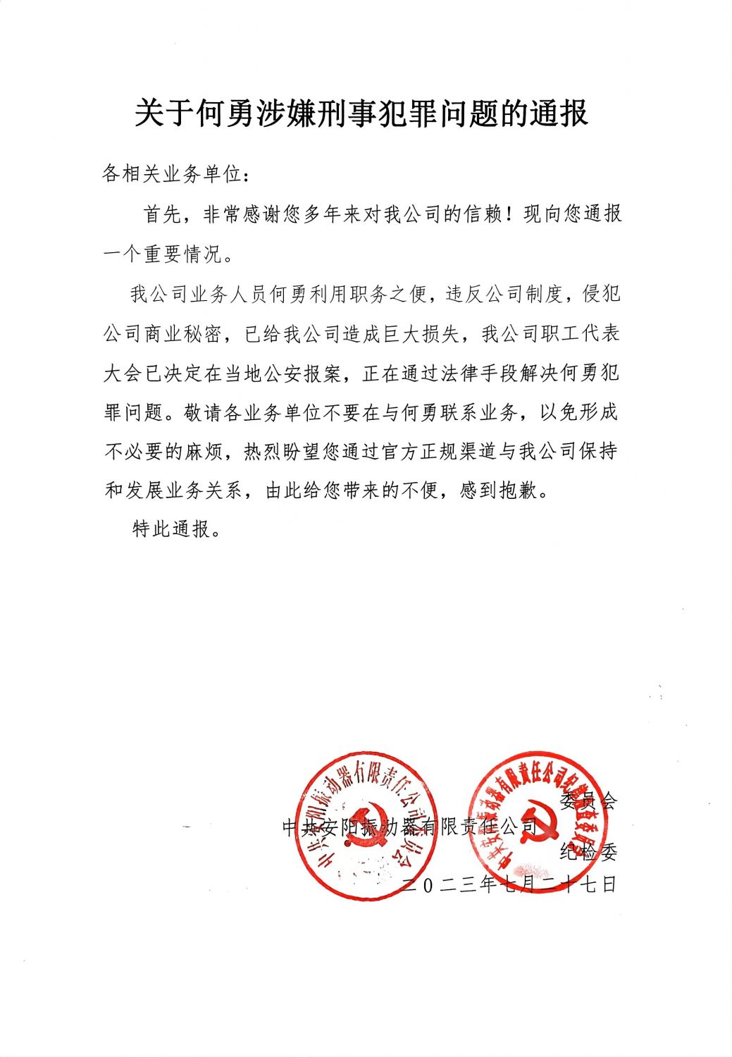 我公司業(yè)務(wù)人員何勇利用職務(wù)之便,違反公司制度,侵犯公司商業(yè)秘密,已給我公司造成巨大損失,我公司職工代表大會(huì)已決定在當(dāng)?shù)毓矆?bào)案,正在通過(guò)法律手段解決何勇犯罪問(wèn)題。敬請(qǐng)各業(yè)務(wù)單位不要在與何勇聯(lián)系業(yè)務(wù),以免形成不必要的麻煩,熱烈盼望您通過(guò)官方正規(guī)渠道與我公司保持和發(fā)展業(yè)務(wù)關(guān)系,由此給您帶來(lái)的不便,感到抱歉。